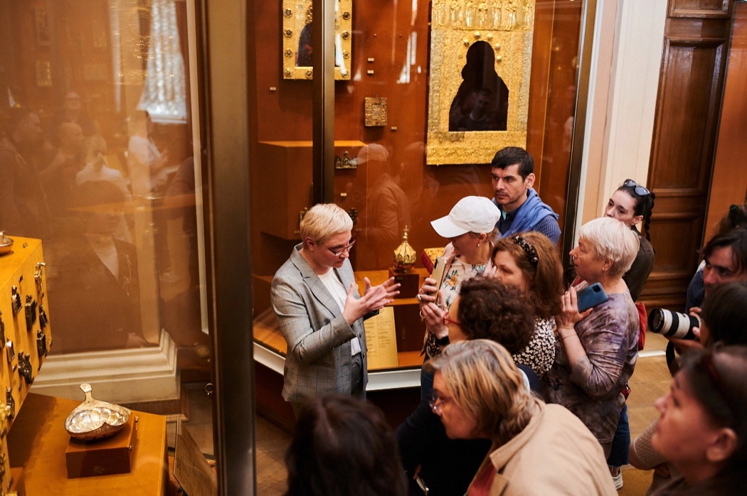 В рамках конференции небольшую экскурсию по Оружейной палате для журналистов провели автор концепции выставки, заведующий экскурсионно-методическим отделом С.П. Брюн и куратор проекта, заведующая научно-хранительским отделом «Музеи-соборы» Музеев Московского Кремля О.А. Цицинова. Они рассказали о том, какие экспонаты, находящиеся в витринах, отправятся в Суздаль.